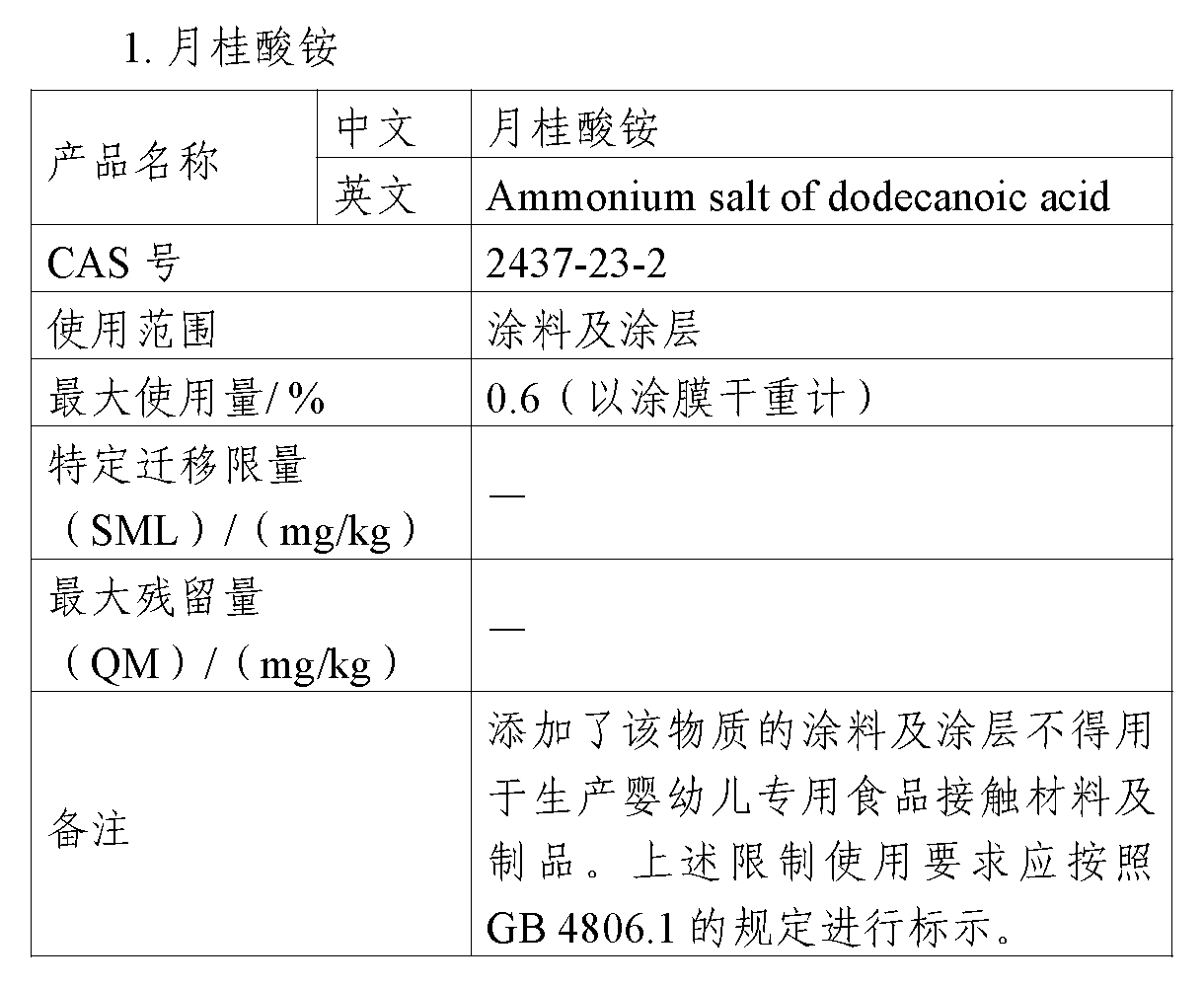 《食品安全國(guó)家標(biāo)準(zhǔn) 食品接觸材料及制品用添加劑使用標(biāo)準(zhǔn)》(GB 9685-2016)已批準(zhǔn)該物質(zhì)作為添加劑用于紙和紙板材料及制品。本次公告批準(zhǔn)其使用范圍擴(kuò)大至食品接觸用涂料及涂層。該物質(zhì)具有較好的乳化、分散效果,可提高所制備涂層的光澤度和透明度。經(jīng)安全性評(píng)估,添加了該物質(zhì)的涂料及涂層可以安全使用。鑒于月桂酸銨用于嬰幼兒人群的安全性資料不足,從風(fēng)險(xiǎn)預(yù)防原則考慮,限制該類(lèi)材料用于生產(chǎn)嬰幼兒專(zhuān)用食品接觸材料及制品。其他使用要求按照公告規(guī)定執(zhí)行。美國(guó)食品藥品管理局、歐洲委員會(huì)、南方共同市場(chǎng)和日本厚生勞動(dòng)省均允許該物質(zhì)用于食品接觸用涂料及涂層。