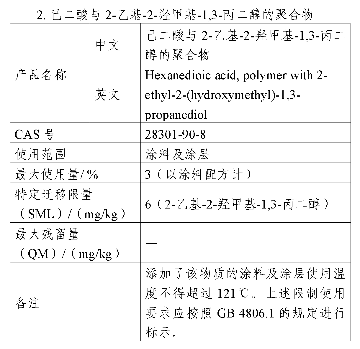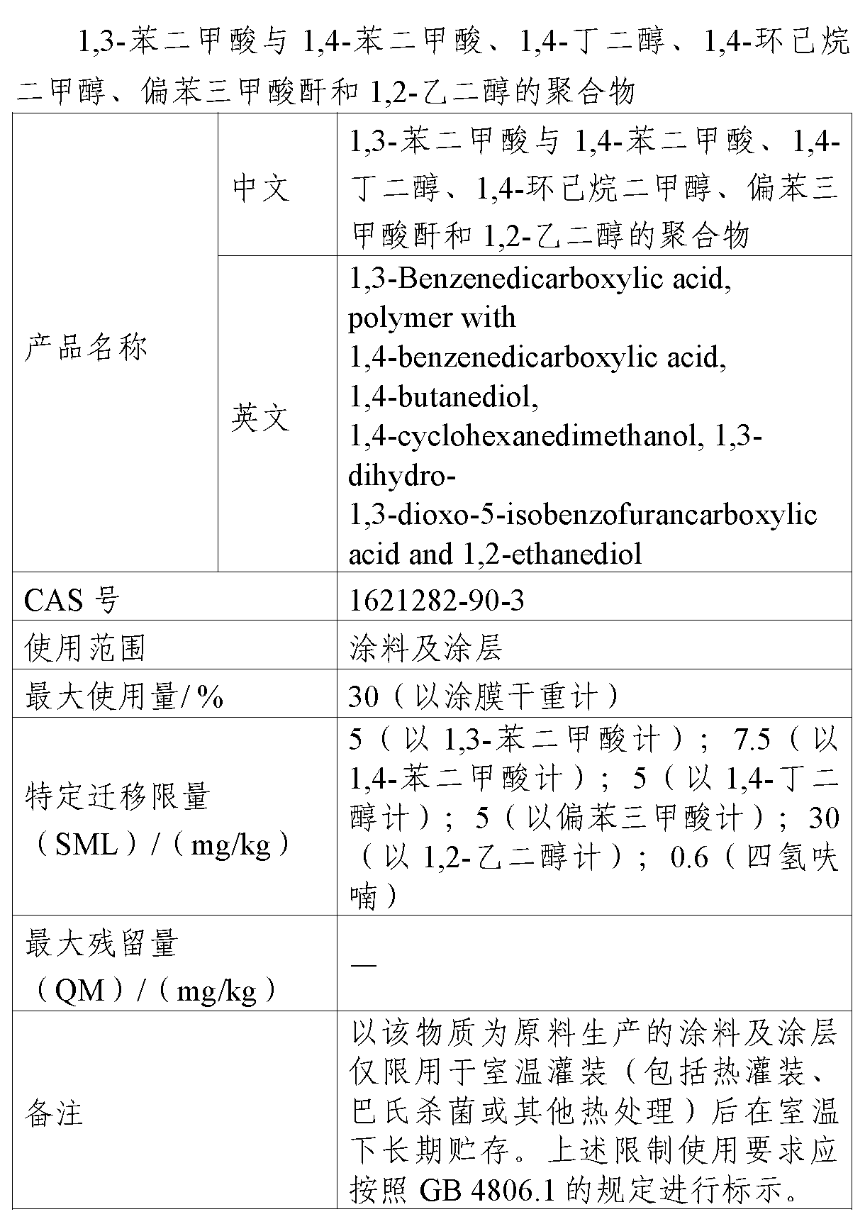 本次公告批準(zhǔn)1,3-苯二甲酸與1,4-苯二甲酸、1,4-丁二醇、1,4-環(huán)己烷二甲醇、偏苯三甲酸酐和1,2-乙二醇的聚合物作為食品接觸用樹(shù)脂新品種用于涂料及涂層。該物質(zhì)是涂料的主要成膜樹(shù)脂,具有良好的抗彎曲性能和耐腐蝕性能。經(jīng)安全性評(píng)估,以該物質(zhì)為原料生產(chǎn)的涂層在室溫灌裝(包括熱灌裝、巴氏殺菌或其他熱處理)后在室溫下長(zhǎng)期貯存的情形下,所有人群均可安全使用。其他使用要求按照公告規(guī)定執(zhí)行。歐洲委員會(huì)和南方共同市場(chǎng)均允許該物質(zhì)用于食品接觸用涂料及涂層。