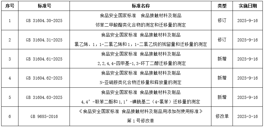 ? 2025年3月27日,國(guó)家衛(wèi)生健康委和國(guó)家市場(chǎng)監(jiān)管總局聯(lián)合發(fā)布2025年第2號(hào)公告,新發(fā)布50項(xiàng)食品安全國(guó)家標(biāo)準(zhǔn)和9項(xiàng)修改單,其中包含5項(xiàng)食品接觸材料標(biāo)準(zhǔn)和1項(xiàng)食品接觸材料標(biāo)準(zhǔn)修改單。