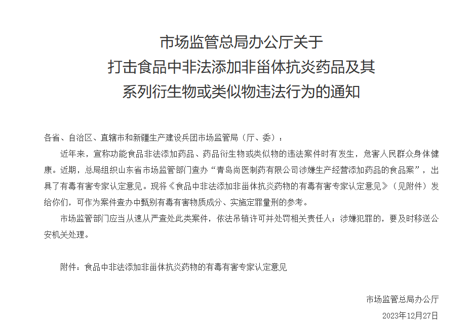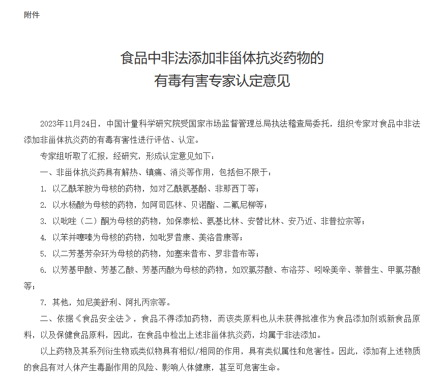 2023年12月,國家市場監(jiān)督管理總局發(fā)布關(guān)于打擊食品中非法添加非甾體抗炎藥品及其系列衍生物或類似物違法行為的通知,加強了對食品中非法添加的監(jiān)管。