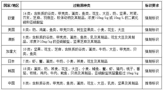 歐盟、美國(guó)、澳新、加拿大、日本、韓國(guó)等國(guó)家和地區(qū)均要求在包裝上強(qiáng)制標(biāo)識(shí)過(guò)敏原,我國(guó)目前僅是推薦標(biāo)識(shí)。不過(guò)GB 7718《預(yù)包裝食品標(biāo)簽通則》征求意見(jiàn)稿中已將其改為強(qiáng)制標(biāo)識(shí),雖尚未實(shí)施,但強(qiáng)制標(biāo)識(shí)已成為必然趨勢(shì),所以建議國(guó)內(nèi)食品企業(yè)未雨綢繆。