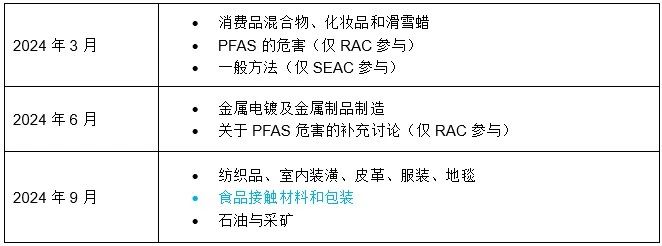 無獨(dú)有偶,近日,歐洲化學(xué)品管理局(ECHA)公布了關(guān)于全氟和多氟烷基物質(zhì)(PFAS)限制提案的2024年計(jì)劃重點(diǎn),其下轄的風(fēng)險(xiǎn)評(píng)估委員會(huì)(RAC)和社會(huì)經(jīng)濟(jì)分析委員會(huì)(SEAC)將在今年舉行3次PFAS會(huì)議。之后,ECHA將向歐盟委員會(huì)提交最終意見,一旦委員會(huì)采納意見,將會(huì)向公眾通報(bào)最終結(jié)果。