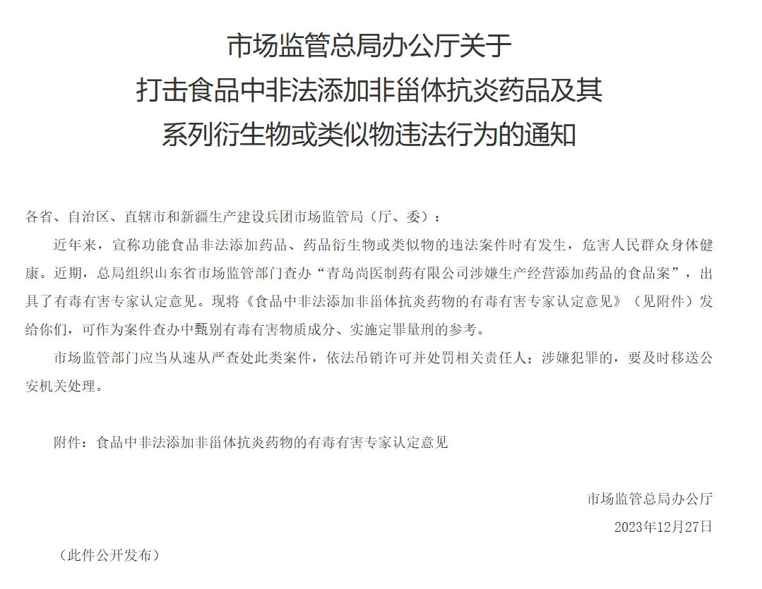 2024年初,市場(chǎng)監(jiān)管總局發(fā)布打擊食品中非法添加非甾體抗炎藥物及其系列衍生物或類似物違法行為的通知。