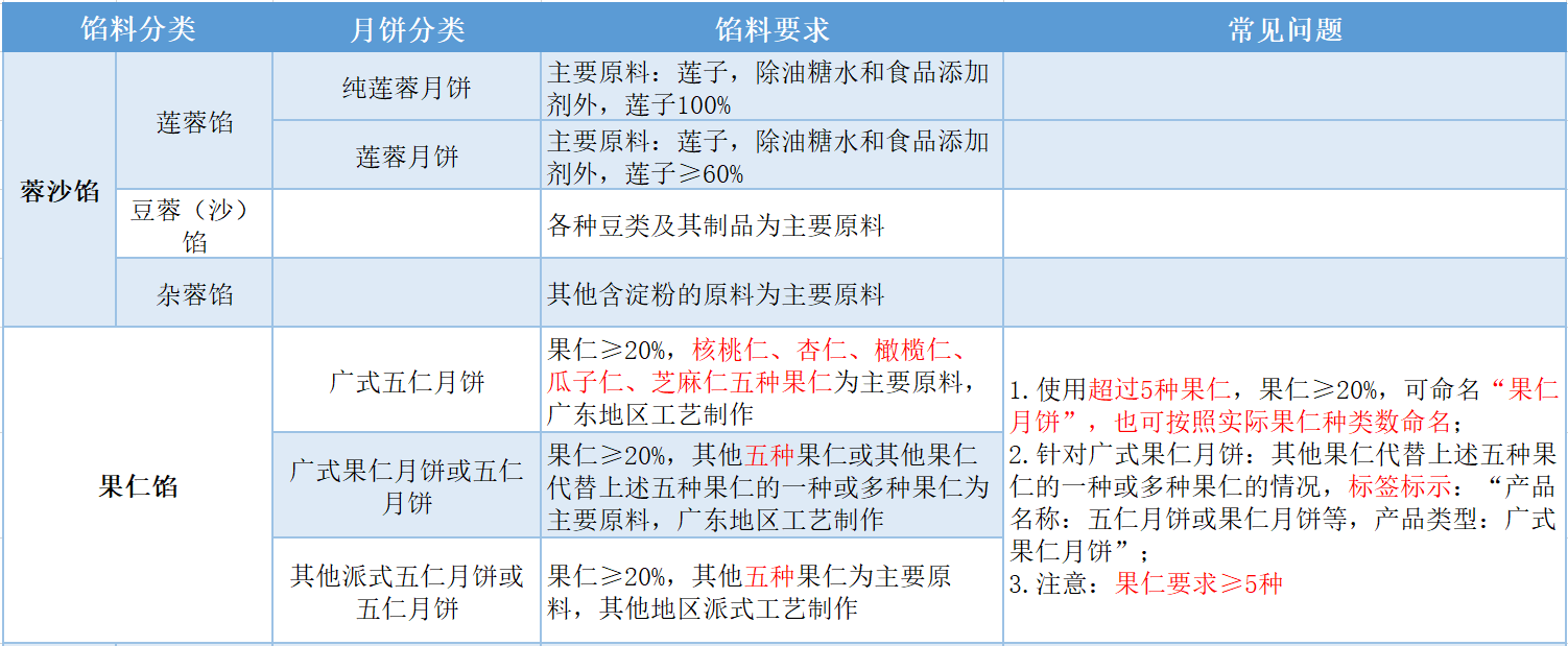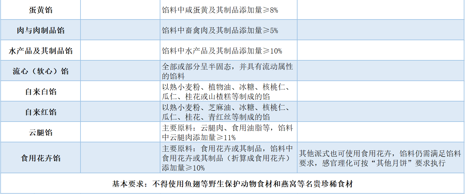 注:本標(biāo)準(zhǔn)中餡料要求與月餅產(chǎn)品命名有直接關(guān)系,產(chǎn)品標(biāo)簽中需標(biāo)出各對應(yīng)配料的添加量。