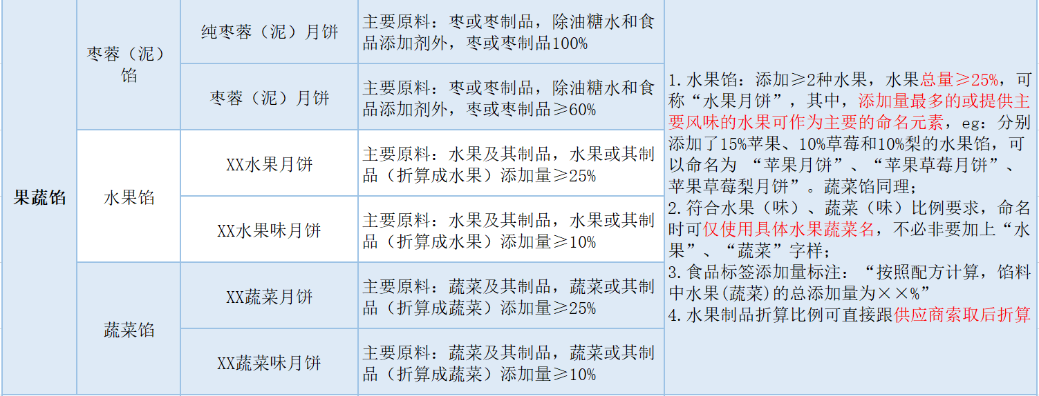 對于水果或其制品(折算成水果)添加量<10%或沒有水果或其制品實物,只加入香精香料:不得使用“水果(味)”命名,按月餅派式和餡料中主要原料類別進(jìn)行命名;根據(jù)產(chǎn)品配料和工藝等具體情況判斷是否屬于“其他類”。