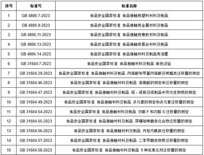2023年9月25日,國(guó)家衛(wèi)生健康委員會(huì)發(fā)布了85項(xiàng)食品安全國(guó)家標(biāo)準(zhǔn)和3項(xiàng)修改單(衛(wèi)健委2023年第6號(hào)公告),其中17項(xiàng)標(biāo)準(zhǔn)涉及食品接觸材料,包括5項(xiàng)產(chǎn)品標(biāo)準(zhǔn)(塑料、金屬、橡膠、復(fù)合材料、油墨)和12項(xiàng)方法標(biāo)準(zhǔn)(遷移試驗(yàn)通則、方法驗(yàn)證通則、特定遷移量檢驗(yàn)方法等)。