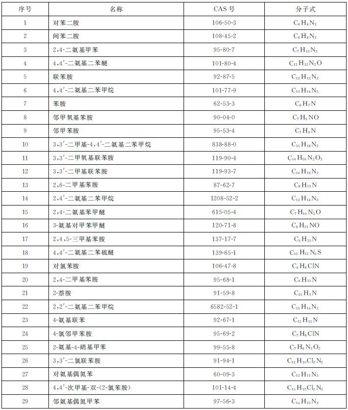 測(cè)試方法標(biāo)準(zhǔn)《GB 31604.52-2021食品安全國(guó)家標(biāo)準(zhǔn) 食品接觸材料及制品 芳香族伯胺遷移量的測(cè)定》給出了如下29種芳香族伯胺的測(cè)定。