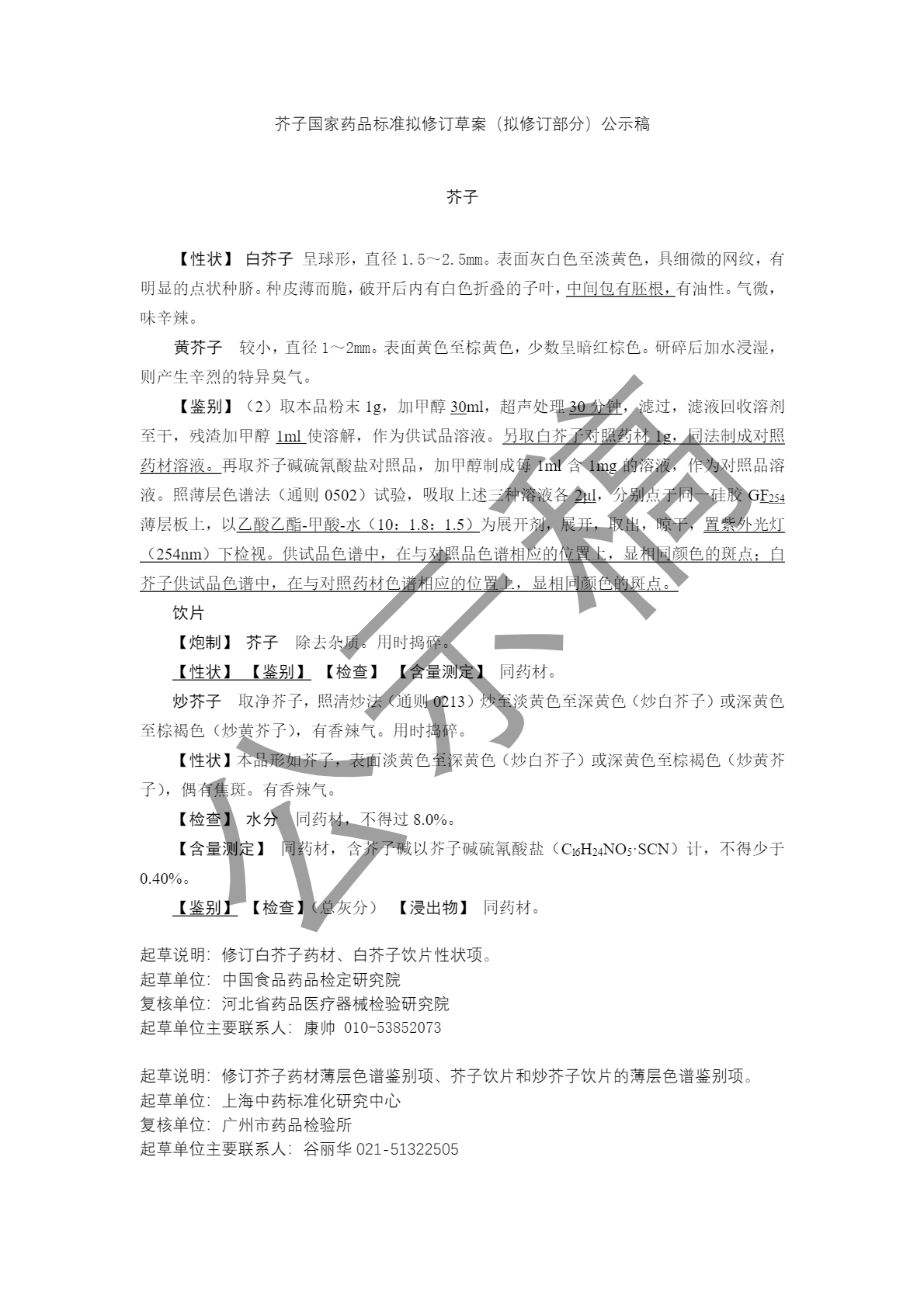 芥 子:修訂白芥子藥材、白芥子飲片性狀項(xiàng);修訂芥子藥材薄層色譜鑒別項(xiàng)、芥子飲片和炒芥子飲片的薄層色譜鑒別項(xiàng)。
