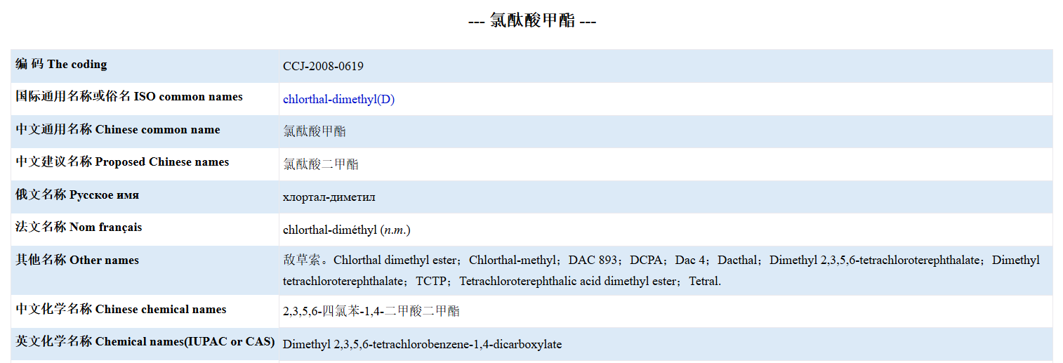 在我國法規(guī)GB 2763中,敵草索被稱為氯酞酸甲酯(Chlorthal-dimethyl),本質(zhì)上是同一種化學(xué)物質(zhì)。