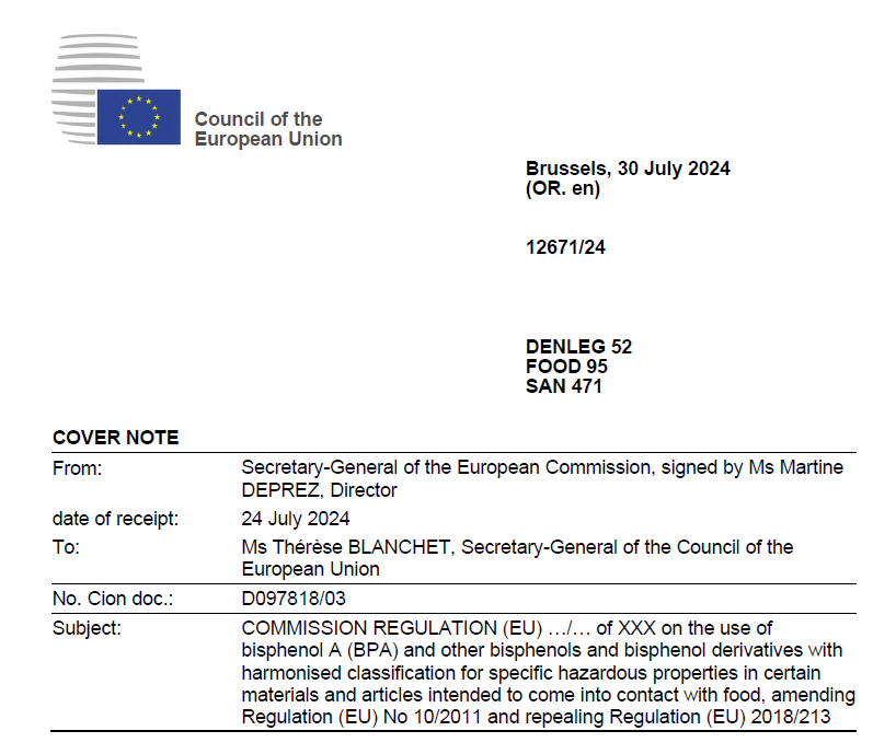 2024年6月12日,歐盟成員國通過了禁止在食品接觸材料(FCM)中使用雙酚A(BPA),這一決定是基于歐洲食品安全局(EFSA)的科學評估,該評估得出的結論是BPA“對免疫系統(tǒng)有潛在的有害影響“并確定BPA的每日可耐受攝入量 (TDI)為0.2 ng/kg bodyweight/day。