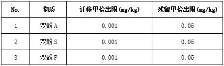 3、雙酚A遷移量的檢出限(detection limit)要求1ug/kg (0.001mg/kg).
