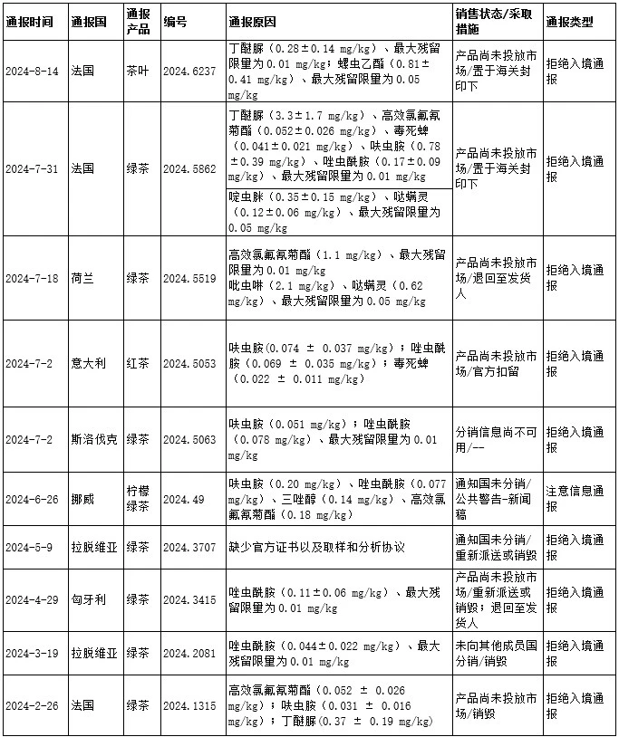 截至2024年8月28日,2024年我國出口茶葉被歐盟通報(bào)的情況如下: