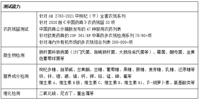 此外,我們擁有完善的枸杞質(zhì)量安全服務(wù)方案,能夠進(jìn)行農(nóng)藥殘留、微生物、重金屬、營養(yǎng)成分等檢測,并提供殺菌工藝驗(yàn)證、臨床研究、感官和消費(fèi)者研究等創(chuàng)新服務(wù)。
