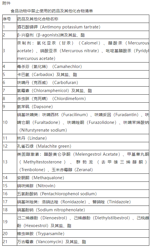 《食品動物中禁止使用的藥品及其他化合物清單》(農業(yè)農村部公告 第250號)