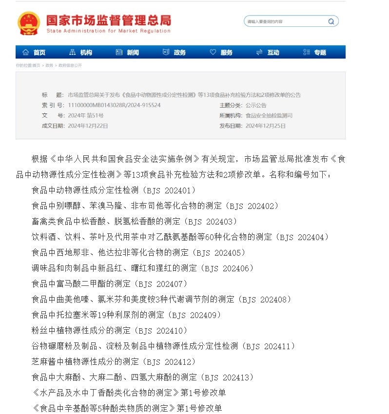 具體來看,這13項(xiàng)食品補(bǔ)充檢驗(yàn)方法涵蓋了多個(gè)方面,包括食品中動(dòng)物源性成分的定性檢測(cè)(BJS 202401)、食品中別嘌醇、苯溴馬隆、非布司他等化合物的測(cè)定(BJS 202402)、畜禽類食品中松香酸、脫氫松香酸的測(cè)定(BJS 202403)等。這些方法的發(fā)布,不僅為食品安全監(jiān)管部門提供了更加準(zhǔn)確、科學(xué)的檢測(cè)手段,也為消費(fèi)者提供了更加安全、放心的食品保障。